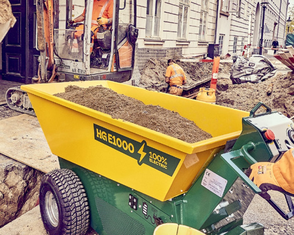 De 100% elektrische HG E1000 minidumper draait tot twee volle werkdagen en is snel en eenvoudig op te laden. De HG E1000 is ontworpen voor professioneel gebruik in veeleisende stedelijke omgevingen. Laadt 1000 kg en ontworpen voor krappe ruimtes.