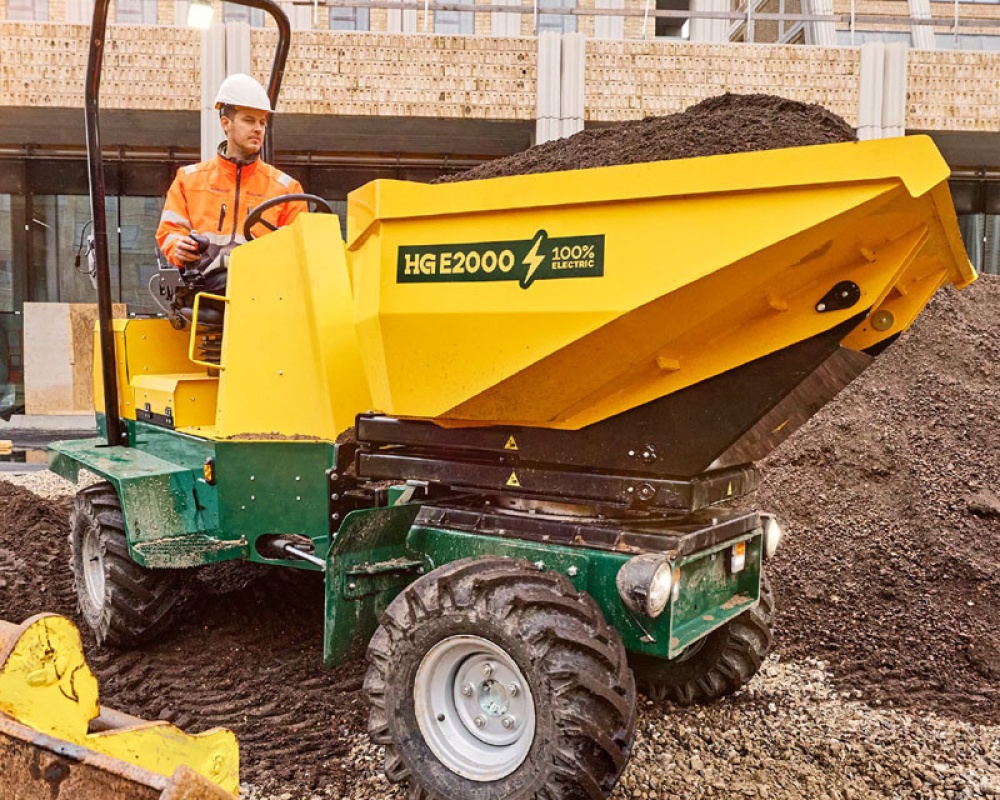 De 100% elektrische HG E1000 High Tip minidumper werkt tot twee volle werkdagen en kan op 125 cm hoogte lossen. De HG E1000 High Tip is een elektrische, hoogwaardige minidumper met een extra voordeel, namelijk de mogelijkheid om direct over de rand en in containers en aanhangers te lossen. De dumper is gebruiksvriendelijk en levert dezelfde uitstekende prestaties als de alternatieven met verbrandingsmotor. Laadt 1000 kg en ontworpen voor krappe ruimtes.